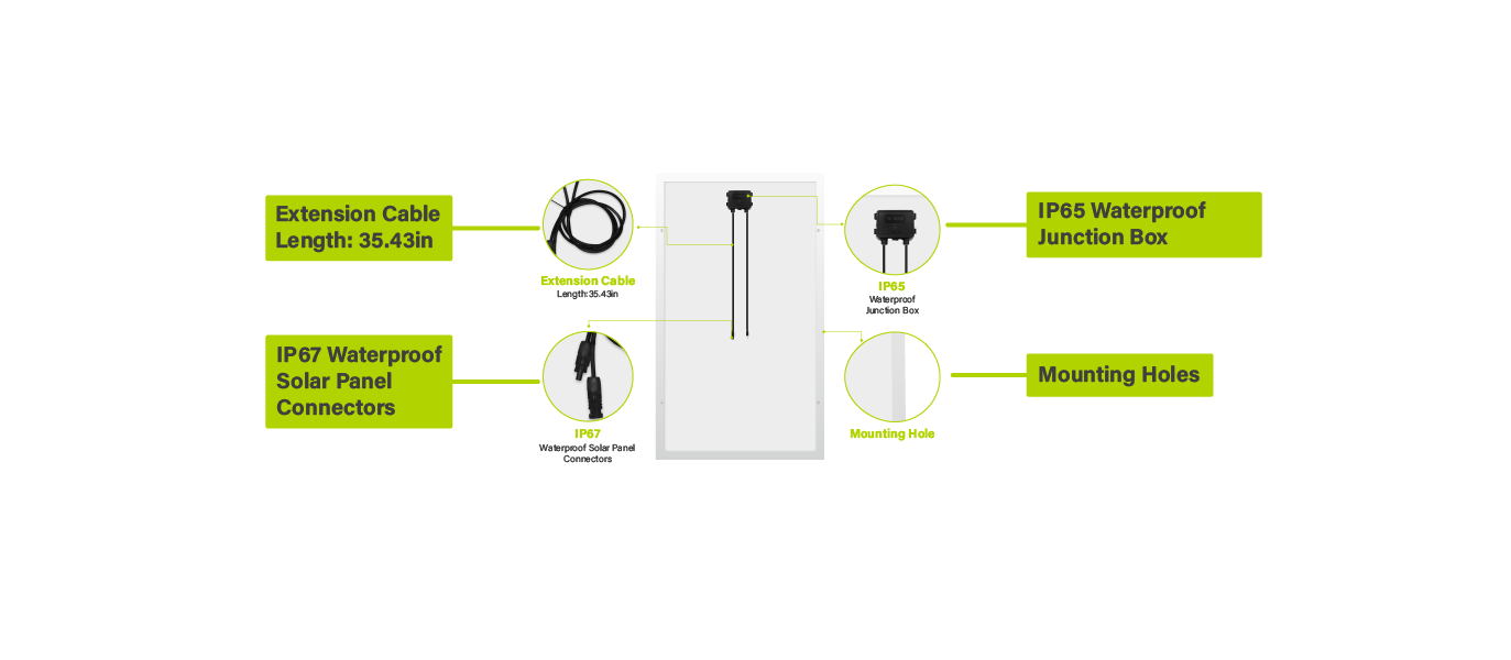 - Built-in bypass diodes within junction box that minimize power drops caused by shading