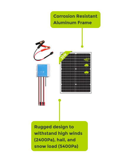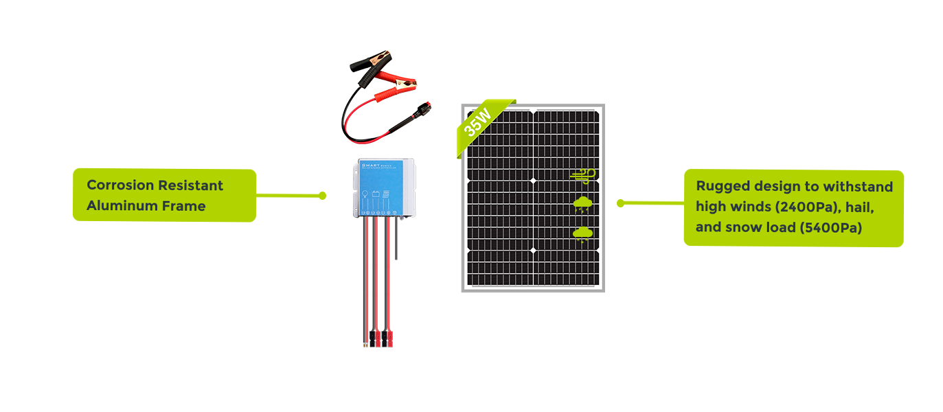 - 1x 35W 12V High efficiency Monocrystalline Solar panel with pre-attached 8ft cables and Anderson connectors. (NPA35S-12J-A)