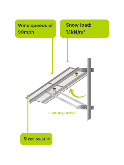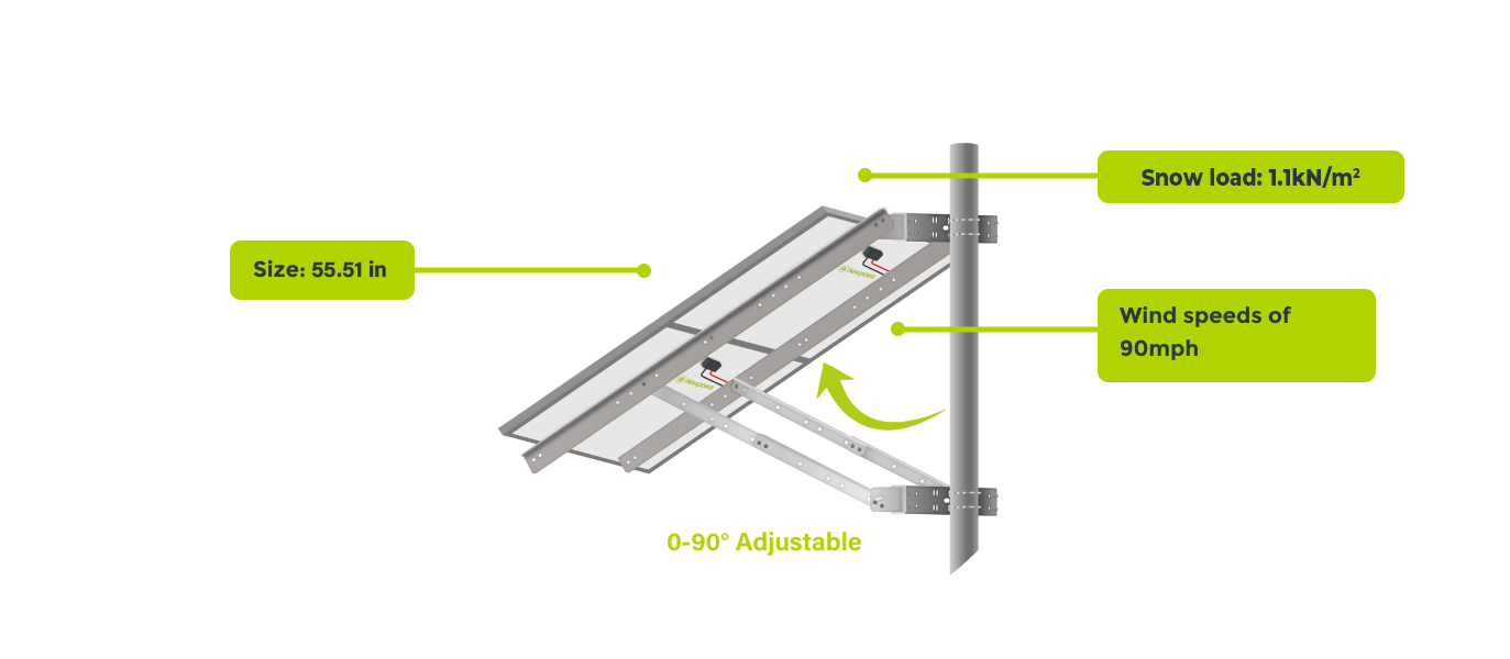 The Newpowa Double Arm Dual Panel Pole Side Mount NPB-410P is designed for up to 400W (Two 100/200W solar panels) at an tilt angle from 0°-90°.