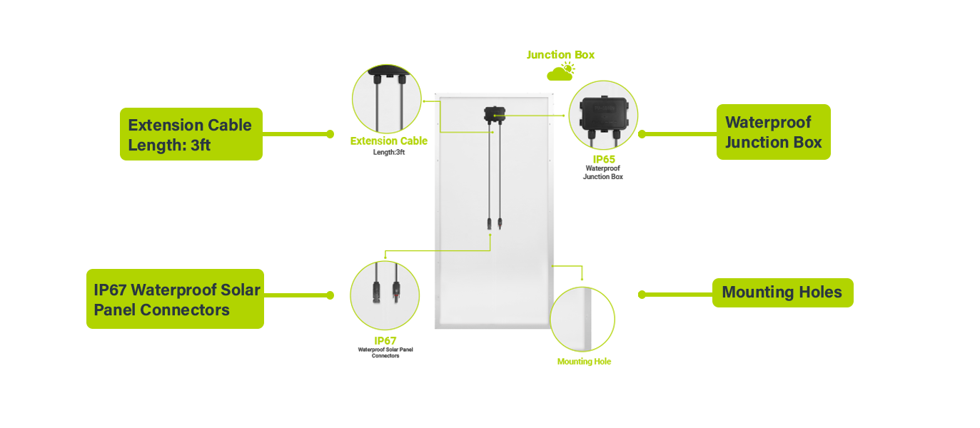 - Pre-installed bypass diodes inside junction box that minimize power drops caused by shading