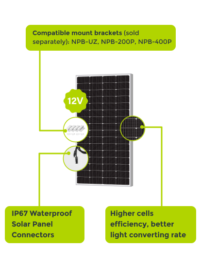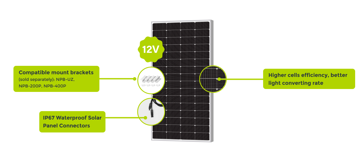 Newpowa's New 200W 12V Monocrystalline High-efficiency Solar Panel is ideal for bringing power to applications when away from the grid. It is commonly used in RV, Marine, Boat, Camping, Traffic signals, and many other applications.